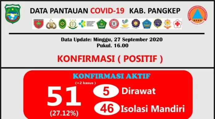 Diketahi saat ini, data Pusdalops Pangkep mencatat sebanyak 51 kasus konfirmasi aktif positif Covid-19, lima dirawat, dan 46 melakukan isolasi mandiri.