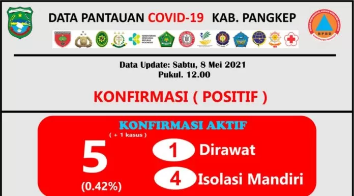"Perhari ini sebanyak 1176 kasus konfirmasi Covid-19 di kabupaten Pangkep, dan saat ini tersisa lima kasus yang masih aktif," kata Juru Bicara Satgas Covid-19 Pangkep dr Annas Ahamad, Sabtu 8 Mei 2021.