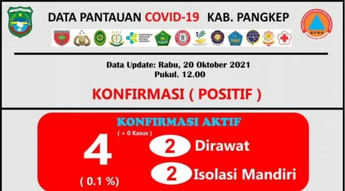 Dari data Pudalops BPDD Pangkep, Rabu 20 Okotber 2021, jumlah kasus terkonfirmasi aktif saat ini tersisa empat kasus. Dua dirawat dan dua lagi melakukan isolasi mandiri.