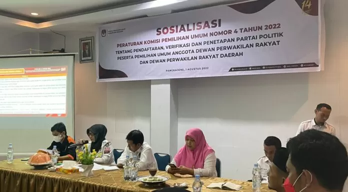 Terkini.id, Pangkep - KPU Kabupaten Pangkajene dan Kepulauan (Pangkep) menggelar sosialisasi PKPU 4 tahun 2022, tentang pendaftaran, verifikasi dan penetapan partai politik peserta pemilihan umum anggota dewan perwakilan rakyat dan dewan perwakilan rakyat daerah, Senin, 1 Agustus 2022 kemarin.